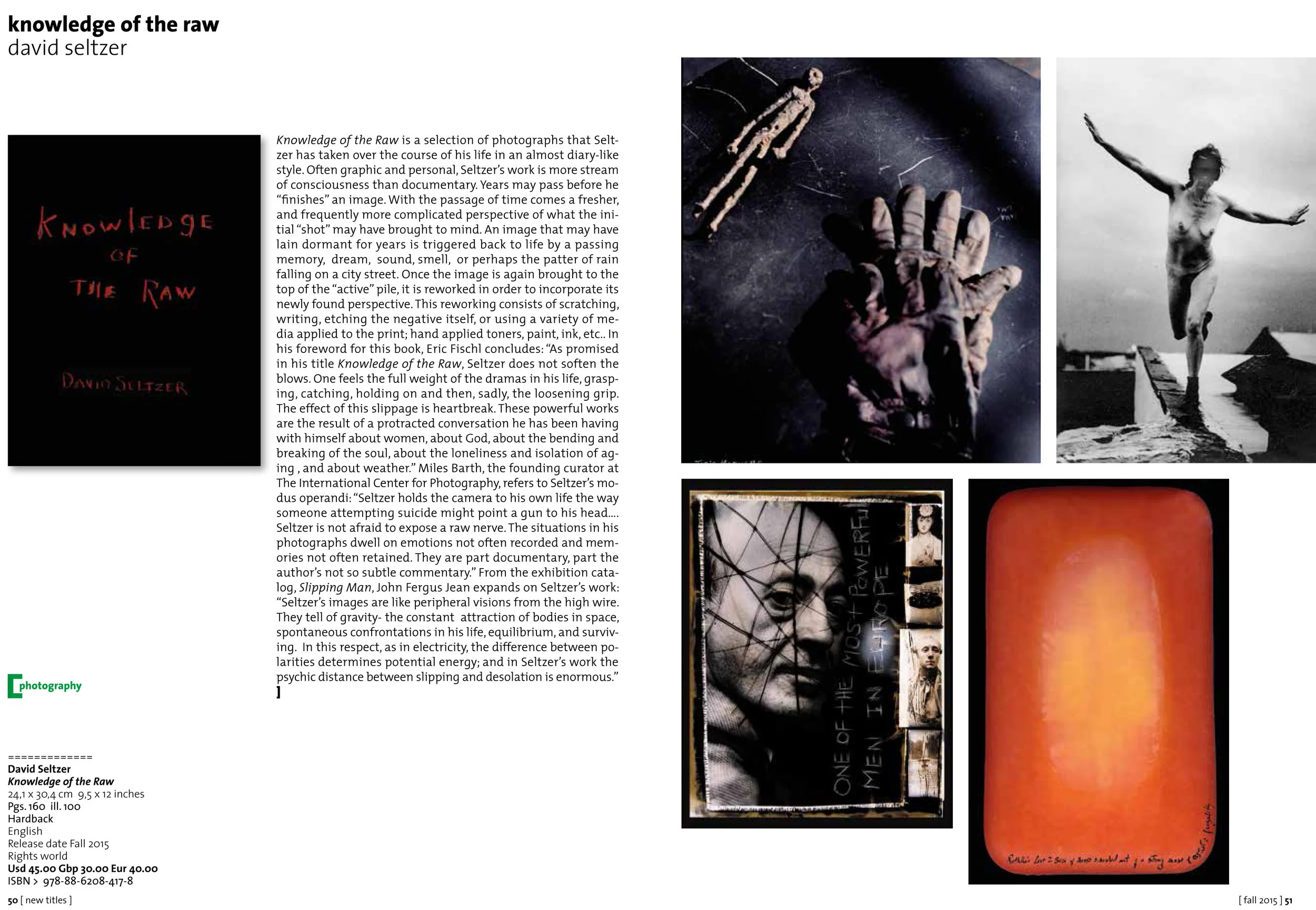 Seltzer's images are like peripheral visions from the high wire. They tell of gravity - the constant attraction of bodies in space, spontaneous confrontations in his life, equilibrium, and surviving. In this respect, as in electricity, the difference between polarities determines potential energy; and in Seltzer's work the psychic distance between slipping and desolation is enormous
